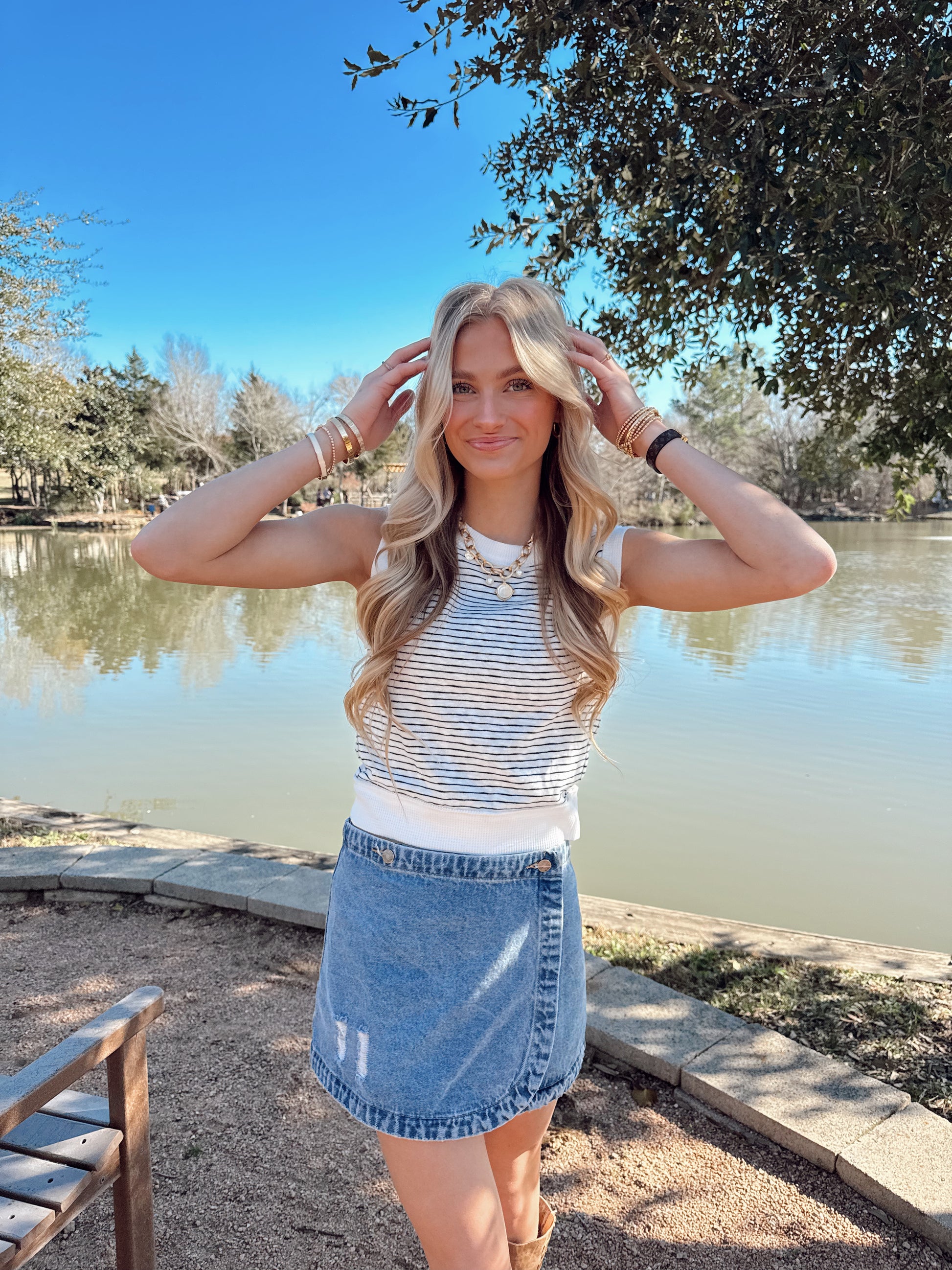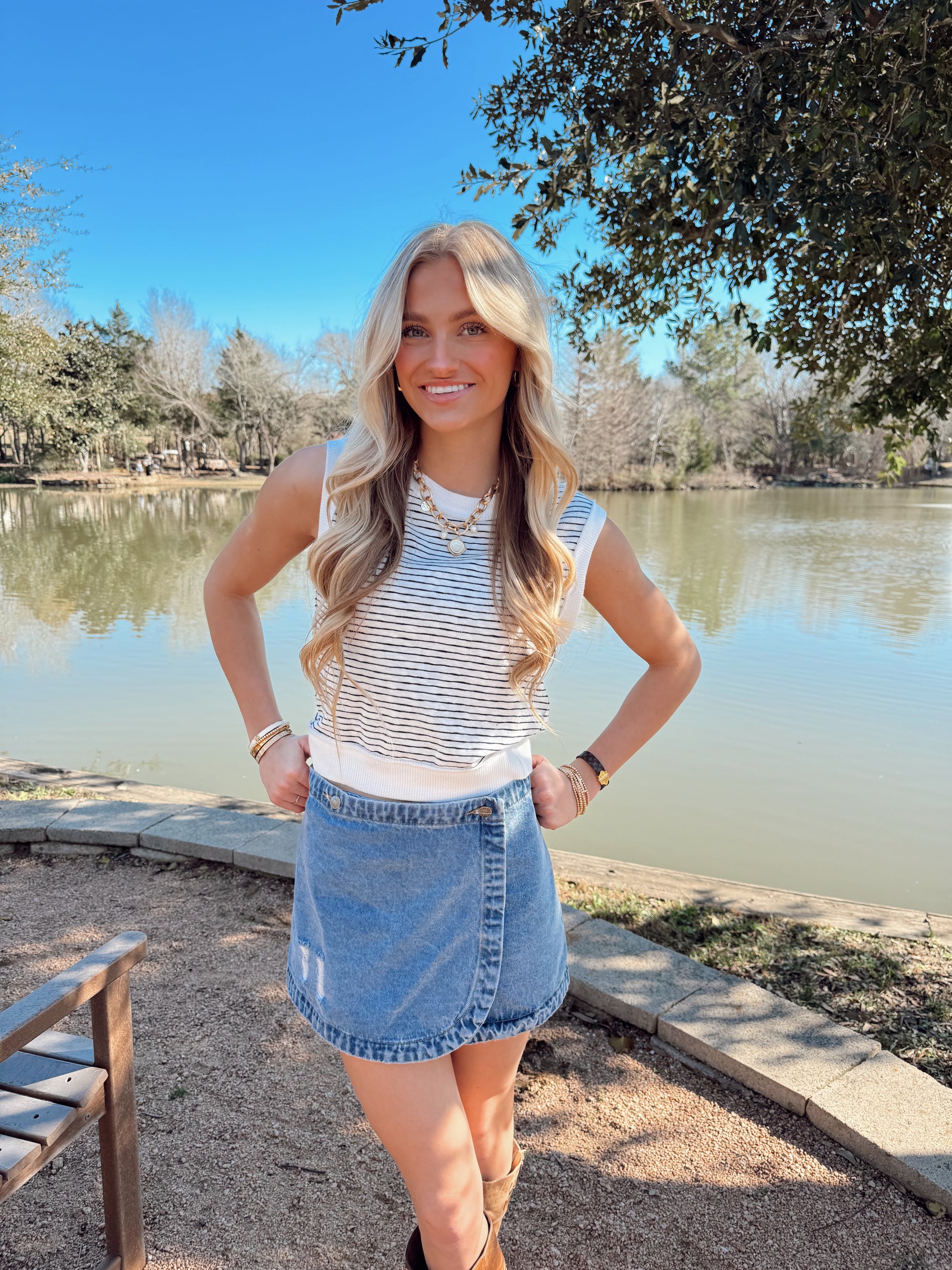 Striped sleeveless tank top featuring a slightly fitted body, a ribbed bottom band, ribbed cuffs and a ribbed rounded neckline.