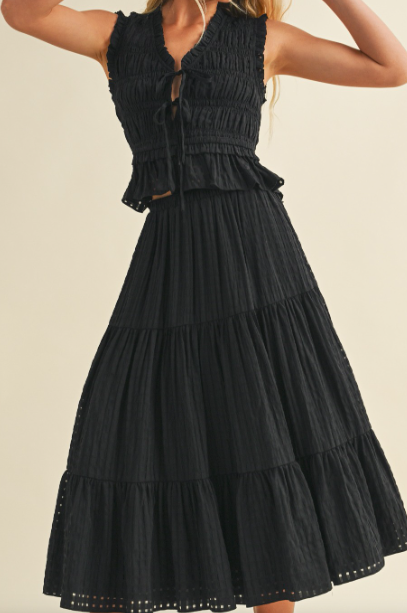 The top features a sleeveless v-neckline with a ruffled trim and front tie closures. It also has a subtle peplum-style hem, giving the bottom a slightly flared appearance. The style is feminine and slightly bohemian, with a fitted silhouette through the torso. The overall look is casual yet elegant. Matching skirt also available!